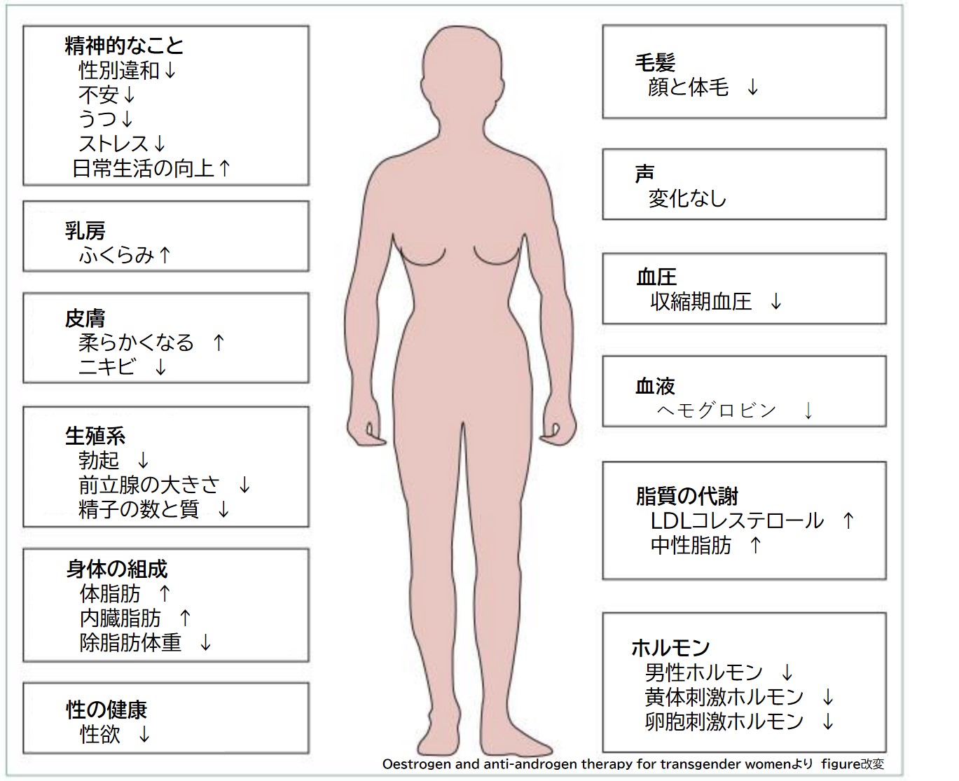 女性化において重要な身体的特徴は、乳房の成長、女性の身体組成(すなわち、臀部に脂肪組織が多く、腹部には脂肪組織が少ない)、そして柔らかい肌です。さらに、性ホルモンは脳に影響を与えて気分を変え、性欲にも影響を与えます(下図)。