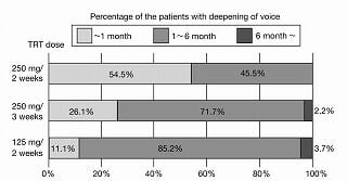 125、250㎎(2週または3週)で治療していても、6か月の時点では、ほぼ全グループで声が低くなったと実感できています。
