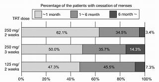 250㎎を2週間で治療した場合は、60%以上のFTMが1カ月以内に生理が消失、250㎎を3週間と125㎎を2週間のグループも治療開始後1カ月以内に半数のひとが生理が消失しています。