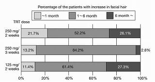 結果は,テストステロンの高用量を受けたグループは、男性ホルモン治療開始1か月後の時点で、これらの身体的変化の開始する割合が多かった。