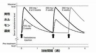 男性ホルモン投与中の平均血清テストステロン濃度はいずれの男性ホルモン投与群でもほぼ同じであったことから、血清テストステロン濃度もいずれの投与群でもほぼ同じであると考えられた。さらに、テストステロンの最大値は最高用量群(250mg/隔週)と最低用量群(125mg/隔週)とで異なるべきである。