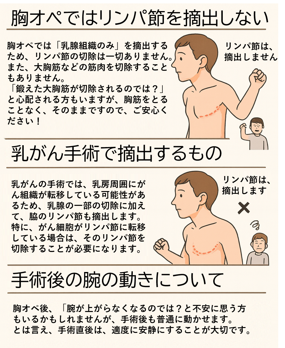 胸オペでは 「乳腺組織のみ」を摘出するため、 リンパ節の切除は一切ありません。