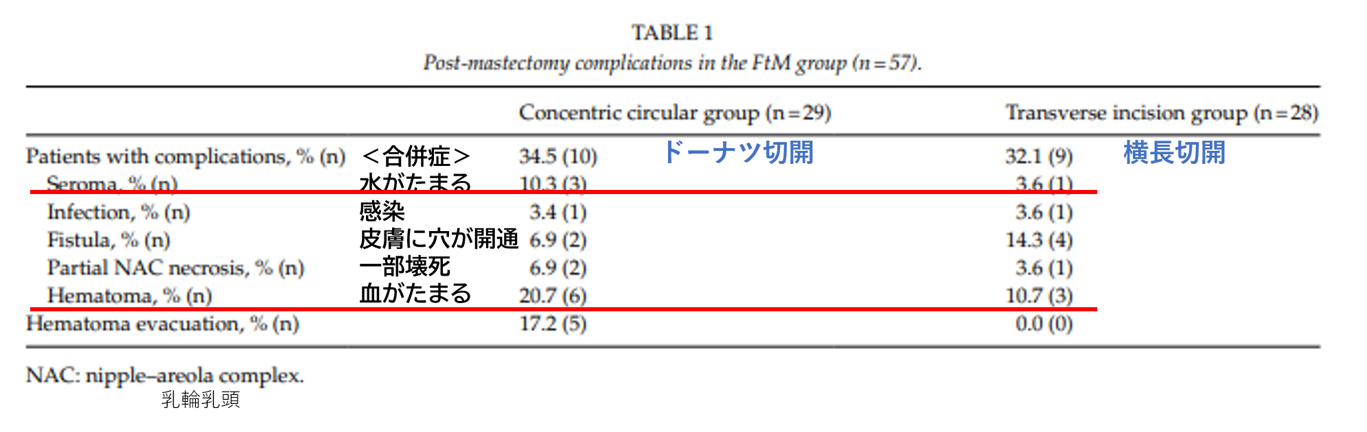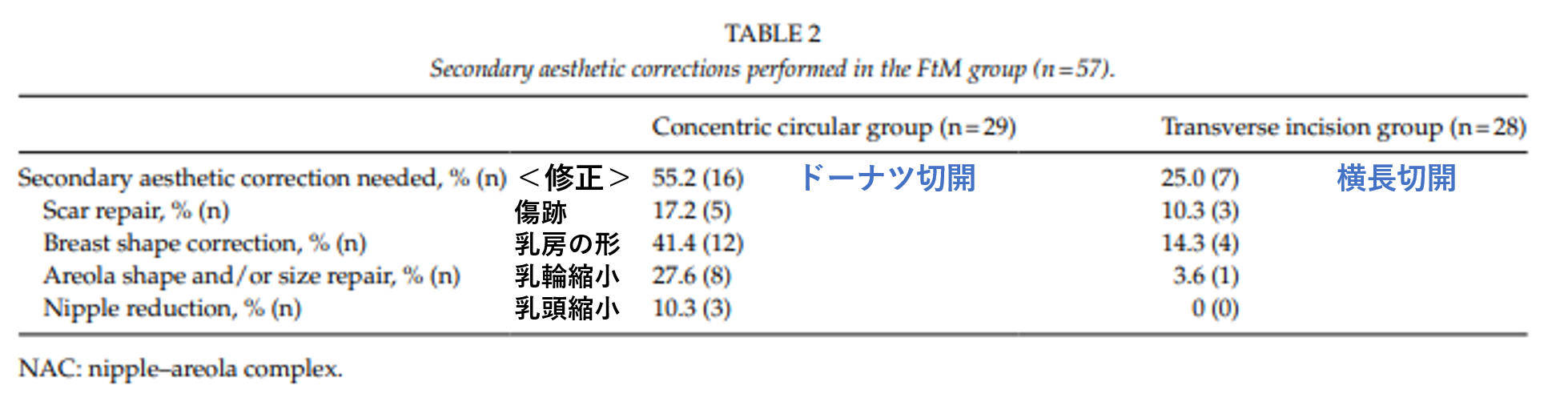 乳房切除術(胸オペ)は、自己イメージを向上させ、新しい性別での生活を容易にし、性別変更プロセスの重要な一部です。この研究では、FtM患者の性転換プロセスにおける最初の手術でした。文献に記載されている最も一般的な乳房切除術(胸オペ)は、同心円状アプローチ、乳房形成術、NAC(乳頭・乳輪)グラフトを用いた乳房切除術であり、これらをいくつか変更したものもあります。