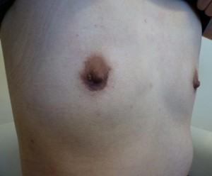 術後、乳輪は多少縮むので、少し小さくなった感じがします。傷跡はどこから切ったのかわからないぐらいです。